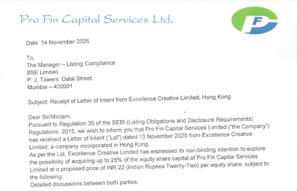 Pro Fin Capital: निवेशकों की नजर सोमवार, 17 नवंबर 2025 को पेनी स्टॉक Pro Fin Capital के शेयर पर रहने वाली है. कम्पनी ने शनिवार देर शाम एक बड़ी जानकारी दी, जिसके तहत Pro Fin Capital को Excellence Creative Ltd., Hong Kong की तरफ से कंपनी में 25 फीसदी हिस्सेदारी खरीदने के लिए Letter of Intent (LOI) प्राप्त हुआ है. इस सौदे की कुल प्रस्तावित कीमत रुपये 22 करोड़ तय की गई है.