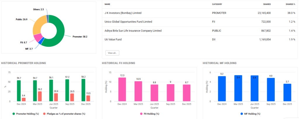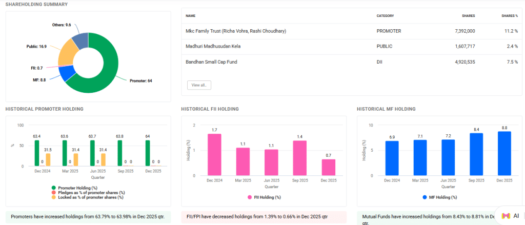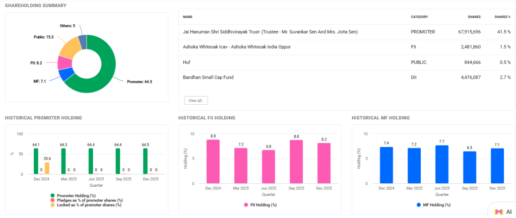 Senco Gold एक ज्वेलरी कंपनी है, जिसका देशभर में मजबूत नेटवर्क है. इसके प्रमोटर भी लगातार बाजार से शेयर खरीद रहे हैं. दिसंबर 2025 तक उनकी हिस्सेदारी बढ़कर 64.47% हो गई है. कंपनी आने वाले समय में नए शहरों में विस्तार की योजना बना रही है. साथ ही सस्ते ज्वेलरी प्रोडक्ट्स पर ध्यान दे रही है, ताकि ज्यादा ग्राहकों को जोड़ा जा सके.