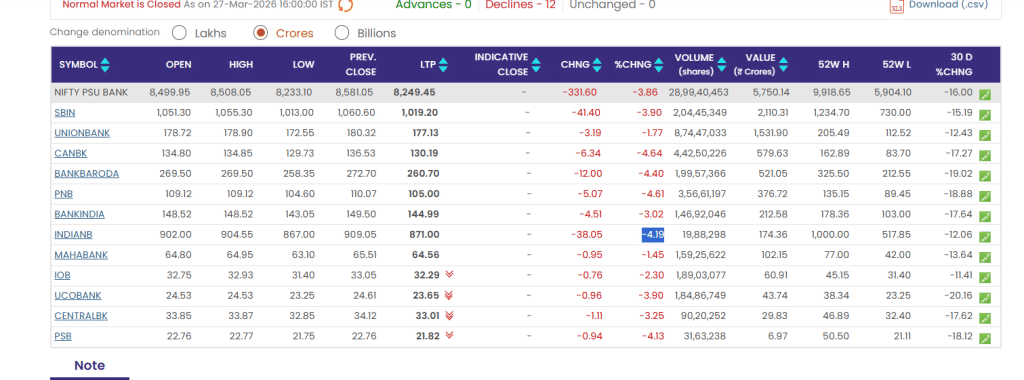 शुक्रवार को शेयर बाजार में भारी गिरावट के बीच PSU बैंक शेयर सबसे ज्यादा प्रभावित रहे. Nifty PSU Bank इंडेक्स करीब 3.86% टूट गया और सभी 12 स्टॉक लाल निशान में रहे. SBI, PNB, Bank of Baroda जैसे बड़े बैंक 4% तक गिरे. युद्ध तनाव, कमजोर रुपया और विदेशी निवेशकों की बिकवाली से बाजार पर दबाव बना.