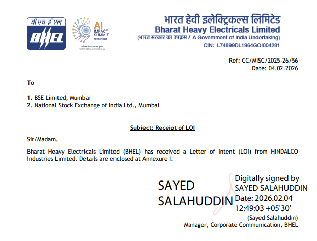 भारत हेवी इलेक्ट्रिकल्स लिमिटेड (BHEL) को हिंडाल्को इंडस्ट्रीज लिमिटेड से एक ऑर्डर प्राप्त हुआ है. यह ऑर्डर ओडिशा के संबलपुर जिले के लापंगा स्थित अदित्य एल्युमिनियम प्लांट में अदित्य विस्तार परियोजना के तहत 2 × 150 मेगावाट BTG पैकेज के लिए है. कंपनी को इसके लिए 3 फरवरी 2026 को लेटर ऑफ इंटेंट (LOI) प्राप्त हुआ है.