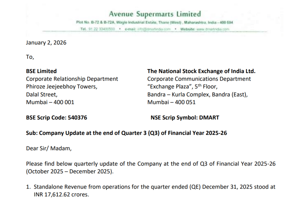 राधाकिशन दमानी की रिटेल कंपनी डीमार्ट एक बार फिर शेयर बाजार में चर्चा का केंद्र बन गई है. कंपनी ने Q3 वित्त वर्ष 2025-26 के लिए बिजनेस अपडेट जारी किया है, जिसमें स्टैंडअलोन रेवेन्यू में 13.15 फीसदी की बढ़ोतरी दर्ज की गई है. तिमाही के दौरान डीमार्ट ने 10 नए स्टोर जोड़े हैं, जिससे कुल स्टोरों की संख्या 442 हो गई है.