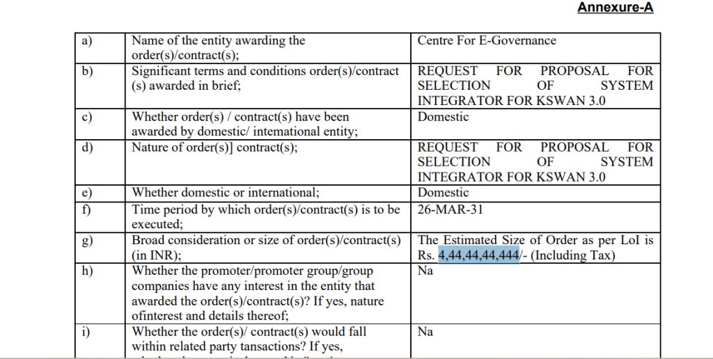 RailTel को Centre For E-Governance से एक बड़े प्रोजेक्ट के लिए लेटर ऑफ इंटेंट (LoI) मिला है. यह ऑर्डर KSWAN 3.0 प्रोजेक्ट के तहत सिस्टम इंटीग्रेटर के चयन से जुड़ा है, जो एक बड़ा डिजिटल इंफ्रास्ट्रक्चर प्रोजेक्ट है. इस ऑर्डर की कुल वैल्यू करीब 4,44,44,44,444 रुपये है. यह एक घरेलू ऑर्डर है और इसमें किसी प्रमोटर या ग्रुप कंपनी की कोई हिस्सेदारी नहीं है.