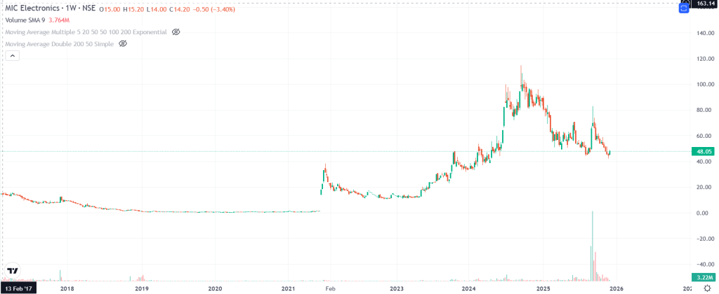 MIC Electronics का मार्केट कैप 1,158.06 करोड़ रुपये है और पिछले 5 साल में कंपनी ने 19.2 फीसदी CAGR की प्रॉफिट ग्रोथ दिखाई है. यह स्टॉक 3 साल में 320 फीसदी और 5 साल में 5,800 फीसदी तक का जबरदस्त मल्टीबैगर रिटर्न दे चुका है. सितम्बर 2025 तक प्रमोटर्स की हिस्सेदारी 58.01 फीसदी है और कंपनी का डेट टू इक्विटी रेश्यो सिर्फ 0.20 है.