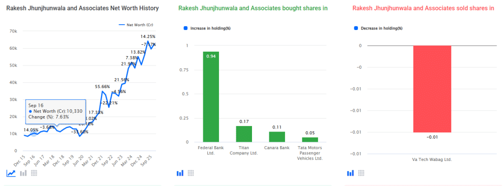 शेयरहोल्डिंग डेटा के अनुसार, रेखा झुनझुनवाला और उनकी एसोसिएट कंपनियों के पास कुल 26 लिस्टेड कंपनियों में हिस्सेदारी है. इन कंपनियों में उनका कुल निवेश मूल्य ₹62,584.5 करोड़ से ज्यादा है. यदि हम दिसंबर 2024 और दिसंबर 2025 की तुलना करें, तो तस्वीर और भी साफ हो जाती है-