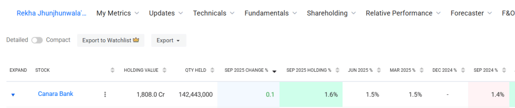 ट्रेंडलाइन वेबसाइट के मुताबिक सितंबर 2025 में रेखा झुनझुनवाला ने अपनी हिस्सेदारी केनरा बैंक में बढ़ाकर 1.6% कर दी है, जो जून 2025 में 1.5% थी. यानी अभी उनके पास इस सरकारी बैंक के 142,443,000 शेयर हैं, जिसकी वैल्यू 1,808 करोड़ रुपये है.