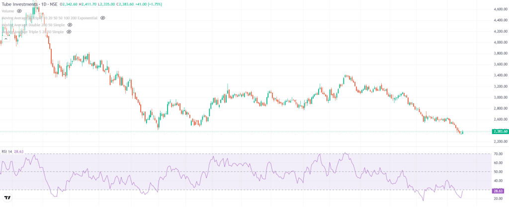 सोमवार को कंपनी का मार्केट कैप करीब 46,019 करोड़ रुपये रहा. शेयर 2,380 रुपये पर बंद हुआ. RSI 28.63 दर्ज किया गया, जो इसे ओवरसोल्ड जोन के करीब दिखाता है और यहां से रिकवरी का मौका बन सकता है.
