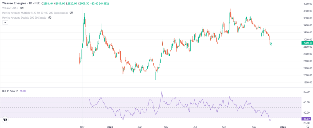 मार्केट कैप मंगलवार को 83,685 करोड़ रुपये रहा. स्टॉक 2,909 रुपये पर बंद हुआ और RSI 28.07 है, जो ओवर्सोल्ड जोन की तरफ इशारा करता है और इसमें टेक्निकल बाउंस की संभावना बन सकती है.