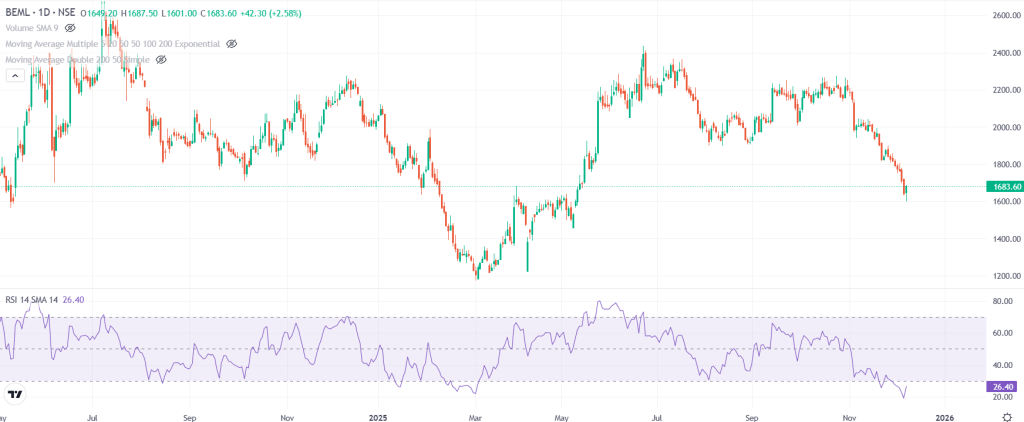 कंपनी का मार्केट कैप मंगलवार को 14,016 करोड़ रुपये रहा. स्टॉक 1,684 रुपये पर बंद हुआ और RSI 26.40 है, जो इसे ओवर्सोल्ड जोन में रखता है और यहां से ऊपर की तरफ रिवर्सल की संभावना दिखती है.