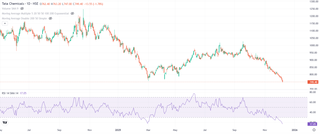 मार्केट कैप मंगलवार को 19,155 करोड़ रुपये रहा. स्टॉक 752 रुपये पर बंद हुआ और RSI सिर्फ 17.05 है, जो गहरी ओवर्सोल्ड पोजीशन दिखाता है. ऐसे में इसमें शॉर्ट-टर्म बाउंस की संभावना काफी मजबूत मानी जाती है.