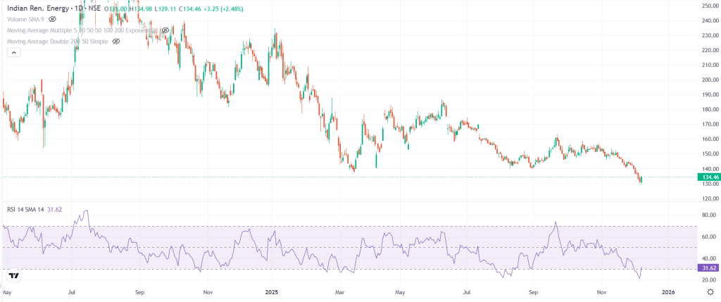 कंपनी का मार्केट कैप मंगलवार को 37,770 करोड़ रुपये रहा. स्टॉक 134 रुपये पर बंद हुआ और RSI 31.62 है. यह लेवल 30 के आसपास है और इसे ओवर्सोल्ड की सीमा पर माना जा रहा है, जिससे इसमें टेक्निकल रिकवरी की संभावना बन सकती है.