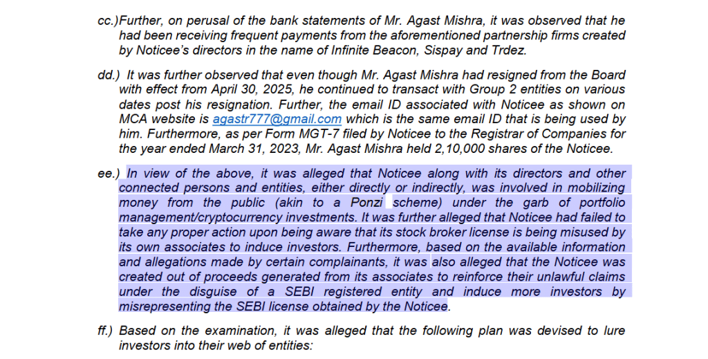 SEBI की जांच में क्रिप्टोकरेंसी, खासकर USDT से जुड़े ट्रांजैक्शन का भी जिक्र सामने आया. कुछ शिकायतों में कहा गया कि निवेशकों का पैसा क्रिप्टो में लगाया गया, जबकि एक डायरेक्टर ने भी इस तरह के लेन-देन में शामिल होने की बात मानी.