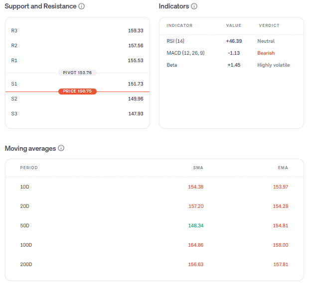 आंकड़ों के अनुसार 11 इंडिकेटर गिरावट की तरफ इशारा कर रहे हैं, जबकि सिर्फ 1 न्यूट्रल और 1 तेजी का संकेत दे रहा है. इसका मतलब है कि फिलहाल बाजार में इस शेयर को लेकर नकारात्मक भावना ज्यादा है. कीमत के स्तर की बात करें तो यह शेयर करीब 150.75 रुपये के आसपास ट्रेड कर रहा है. इसके ऊपर जाने के लिए 155 से 159 रुपये के बीच रेजिस्टेंस जोन है, यानी यहां पहुंचकर शेयर को रुकावट मिल सकती है. वहीं नीचे की तरफ 151 रुपये से 147 रुपये तक सपोर्ट है, जहां से शेयर को सहारा मिल सकता है. अगर यह इन सपोर्ट लेवल से नीचे जाता है तो और गिरावट आ सकती है.