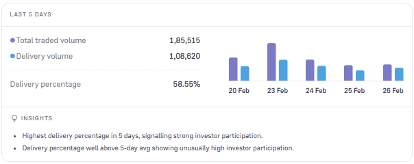 वॉल्यूम डेटा के अनुसार पिछले 5 दिनों में डिलीवरी प्रतिशत करीब 58.55 प्रतिशत रहा है, जो अच्छा माना जाता है. इसका मतलब है कि निवेशक इस शेयर को खरीदकर होल्ड कर रहे हैं, जिससे इसमें रुचि बनी हुई है. शेयर के हाल के टेक्निकल डेटा के अनुसार इसमें कमजोरी के संकेत ज्यादा दिख रहे हैं. कुल मिलाकर यह स्टॉक अभी स्ट्रॉन्गली बियरिश यानी गिरावट के ट्रेंड में माना जा रहा है.