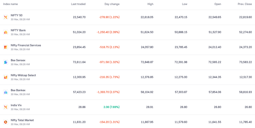Stock Market Today: इस तिमाही के आखिरी ट्रेडिंग दिन शेयर बाजार में कमजोरी साफ नजर आई. निवेशकों का भरोसा थोड़ा कमजोर दिखा और बाजार की शुरुआत ही गिरावट के साथ हुई. सुबह से ही संकेत मिल रहे थे कि बाजार दबाव में रहेगा. GIFT Nifty करीब 270 अंक नीचे था, जिससे साफ था कि बाजार लाल निशान में खुल सकता है. सोमवार को वही हुआ. बाजार खुलते ही सेंसेक्स और निफ्टी दोनों में तेज गिरावट देखी गई. इसकी वजह से बाजार खुलते ही निवेशकों के 6 लाख करोड़ से ज्यादा डूब गए. हालांकि बाजार बाद में थोड़ा रिकवर होता दिखा. और 10 बजे के करीब सेंसेक्स 750 अंक और निफ्टी 200 अंकों से ज्यादा की गिरावट पर ट्रेड कर रहे थे.