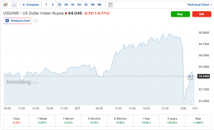 भारतीय रुपया आज मजबूती के साथ खुला. रुपया डॉलर के मुकाबले 1.3% बढ़कर 93.5875 पर पहुंच था. हालांकि बाद में इसमें 0.77 फीसदी की गिरावट देखने को मिली. इससे पहले पिछले सत्र में यह 94.8125 पर बंद हुआ था. रुपया मजबूत होने से आयात लागत कम हो सकती है और बाजार में सकारात्मक संकेत मिलते हैं.