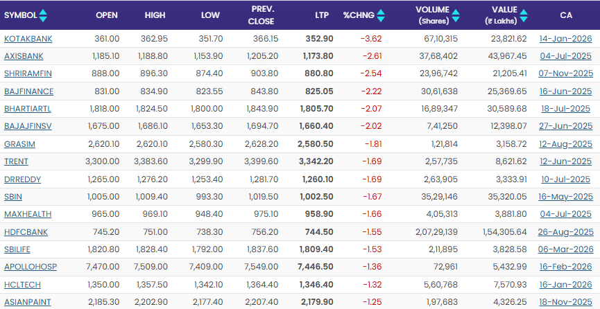आज बैंक निफ्टी समेत कई इंडेक्स में गिरावट देखी गई. Nifty Bank में ज्यादा कमजोरी देखने को मिली. यह इंडेक्स करीब 1,250 अंक यानी 2.39% गिरकर 51,024 के आसपास पहुंच गया. कारोबार के दौरान इसने 51,624 का हाई और 50,888 का लो बनाया. इसके अलावा Nifty Financial Services भी दबाव में रहा. यह इंडेक्स करीब 518 अंक यानी 2.13% गिरकर 23,854 के आसपास ट्रेड करता दिखा.