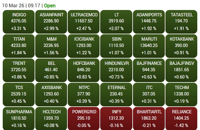 शुरुआती ट्रेडिंग में इंडिगो करीब 3.31% की तेजी के साथ टॉप गेनर रहा. इसके अलावा एशियन पेंट्स 2.99%, अल्ट्राटेक सीमेंट 2.47% और एलएंडटी 2.07% की बढ़त के साथ कारोबार करते दिखे. वहीं अडानी पोर्ट्स 1.92% और टाटा स्टील 1.91% चढ़कर ट्रेड करते नजर आए.