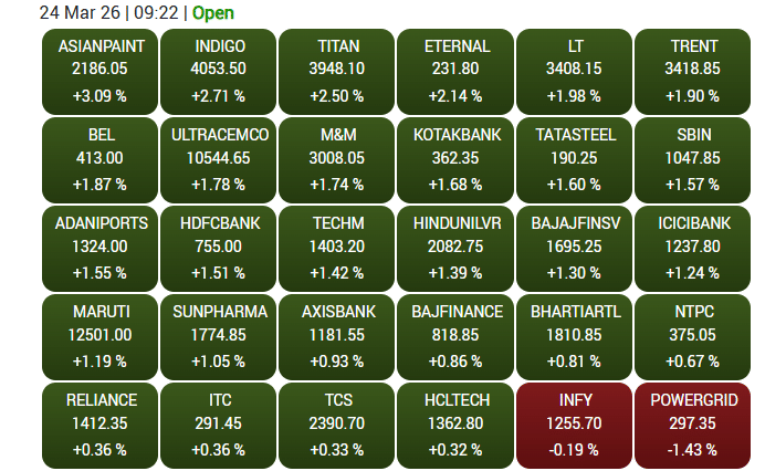 मंगलवार को भारतीय शेयर बाजार ने मजबूत वैश्विक संकेतों के दम पर तेज शुरुआत की. निफ्टी और सेंसेक्स दोनों बड़ी बढ़त के साथ खुले. बैंकिंग, ऑटो और आईटी शेयरों में खरीदारी रही. एशियन पेंट्स, इंडिगो और टाइटन जैसे शेयर चढ़े, जबकि इंफोसिस और पावरग्रिड में हल्की गिरावट दिखी.