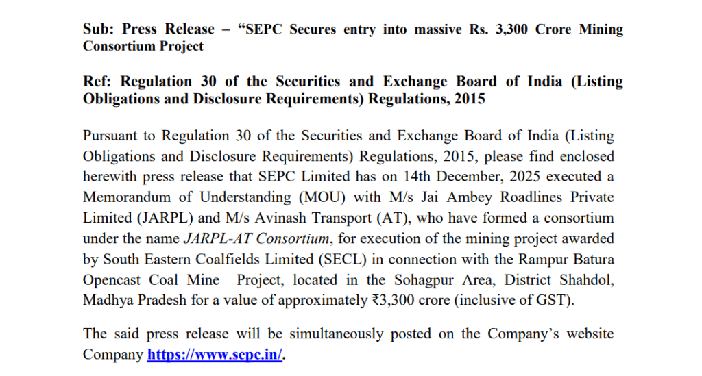 SEPC Limited ने 14 दिसंबर 2025 को एक मेमोरेंडम ऑफ अंडरस्टैंडिंग पर साइन किया है. यह प्रोजेक्ट साउथ ईस्टर्न कोलफील्ड्स लिमिटेड यानी SECL द्वारा दिया गया है. इस प्रोजेक्ट को JARPL AT कंसोर्टियम को मिला है, जिसमें Jai Ambey Roadlines प्राइवेट लिमिटेड और Avinash Transport शामिल हैं. SEPC Limited ने दोनों कंसोर्टियम पार्टनर्स के साथ Rampur Batura ओपनकास्ट कोल माइन प्रोजेक्ट के लिए एग्रीमेंट किया है. यह कोयला खदान मध्य प्रदेश के शहडोल जिले के सोहागपुर इलाके में स्थित है.