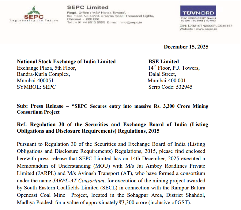 कंपनी ने बताया कि रविवार, 14 दिसंबर को उसने Jai Ambey Roadlines Pvt. Ltd. और Avinash Transport के साथ एक मेमोरेंडम ऑफ अंडरस्टैंडिंग (MoU) साइन किया है. इन तीनों कंपनियों ने मिलकर JARPL-AT नाम से एक कंसोर्टियम बनाया है, जिसे यह बड़ा माइनिंग प्रोजेक्ट मिला है. यह प्रोजेक्ट South Eastern Coalfields Ltd. (SECL) द्वारा आवंटित किया गया है.