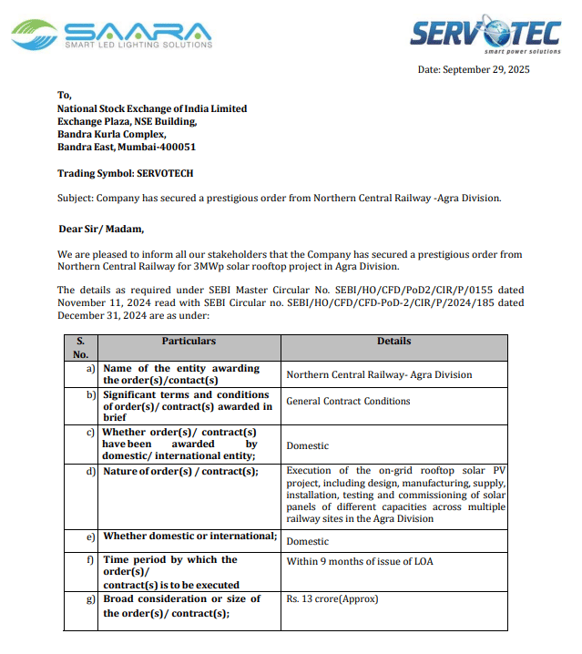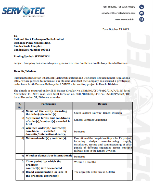 Servotech Renewable Power Bags Railway Order: 13 अक्टूबर 2025, सोमवार को Servotech Renewable Power Systems Ltd के शेयरों में हलचल देखी गई. कंपनी ने बताया कि उसे इंडियन रेलवे से 2.58 मेगावाट (MW) का सोलर रूफटॉप प्रोजेक्ट ऑर्डर मिला है. यह ऑर्डर साउथ ईस्टर्न रेलवे की रांची डिवीजन के लिए है. इस ऑर्डर अपडेट के बाद कंपनी के शेयरों में हरियाली नहीं दिखी. आइए ऑर्डर के बारे में विस्तार से बताते हैं.