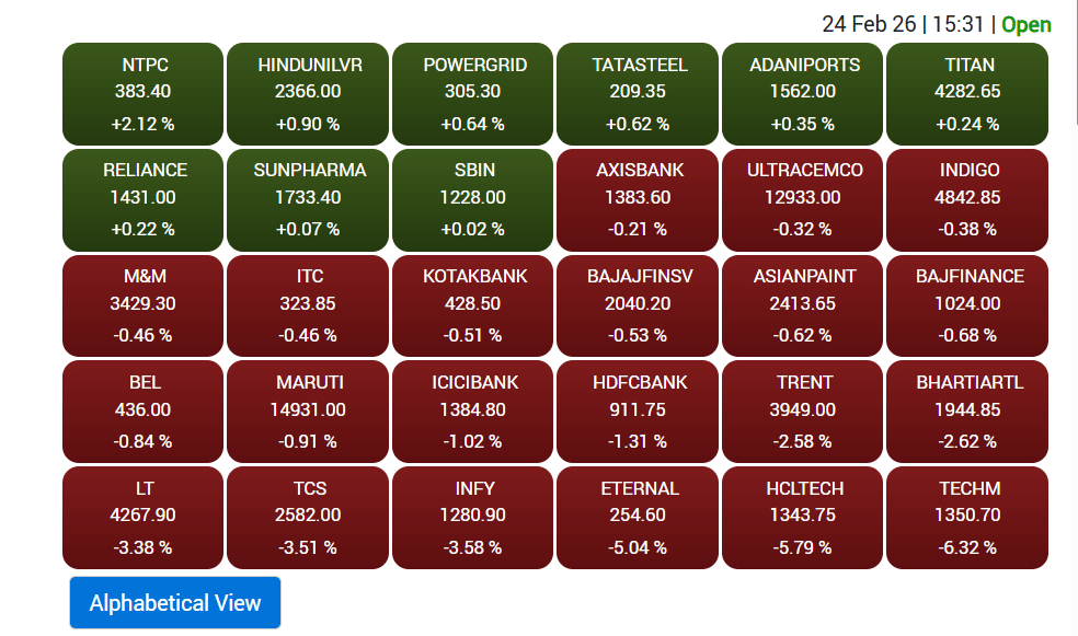 निफ्टी के टॉप लूजर्स में टेक महिंद्रा, इटरनल, इंफोसिस, टीसीएस और एचसीएल टेक्नोलॉजीज शामिल रहे, जहां भारी बिकवाली देखने को मिली. वहीं एचयूएल, सन फार्मा, पावर ग्रिड कॉर्प, एनटीपीसी और जेएसडब्ल्यू स्टील जैसे शेयरों में खरीदारी का रुख रहा.