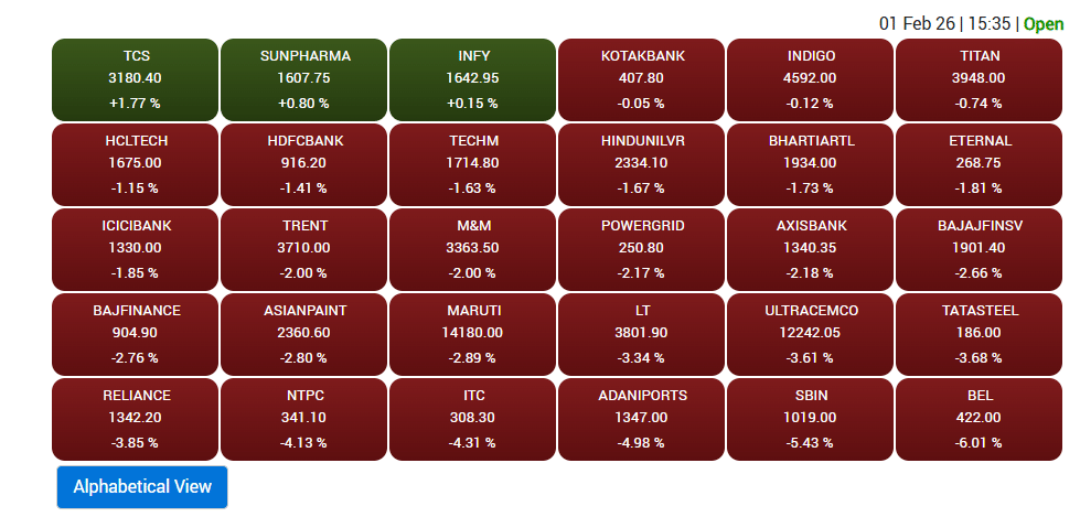 Stock Market Closing Bell: आज, रविवार यानी बजट के दिन बाजार की शुरुआत कमजोर हुई थी. हालांकि जैसे ही संसद में बजट पेश होना शुरु हुआ वैसे ही बाजार में शानदार तेजी देखने को मिली. फिर जैसे ही STT बढ़ोतरी करने की बात कही गई वैसे ही बाजार भर-भराकर टूट गया. अंत में सेंसेक्स 1,546 अंकों की गिरावट के साथ 80,722 पर बंद हुआ, जबकि निफ्टी 495 अंक गिरकर 24,825 के नीचे क्लोज हुआ. निफ्टी पर ONGC, SBI, Hindalco Industries, Coal India और Bharat Electronics सबसे बड़े लूजर्स रहे, जबकि Wipro, TCS, Titan Company, Max Healthcare और Infosys में खरीदारी देखने को मिली और ये शेयर बढ़त के साथ बंद हुए. एडवांस-डिक्लाइन की बात करें तो ब्रॉडर मार्केट में भी दबाव साफ दिखा.