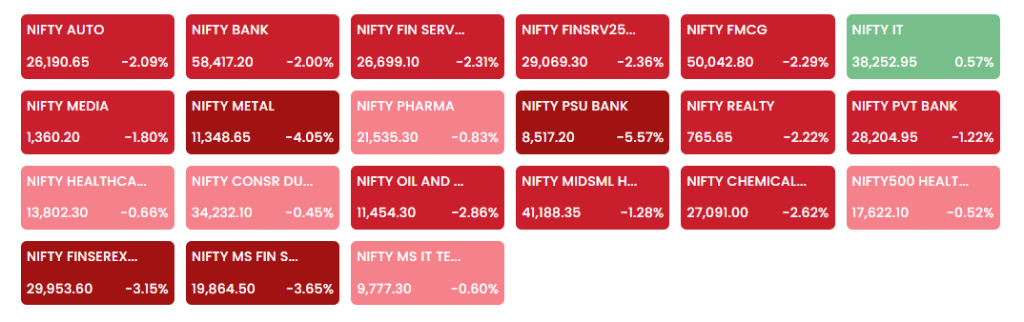 निफ्टी मिडकैप इंडेक्स 1.8 फीसदी टूटा, जबकि स्मॉलकैप इंडेक्स में 2.8 फीसदी की भारी गिरावट दर्ज की गई. सेक्टरवाइज देखें तो IT और कंज्यूमर ड्यूरेबल्स को छोड़कर सभी सेक्टोरल इंडेक्स लाल निशान में बंद हुए. मेटल इंडेक्स करीब 3 फीसदी, PSU बैंक इंडेक्स 4 फीसदी, ऑयल एंड गैस 2 फीसदी और कैपिटल गुड्स इंडेक्स भी करीब 2 फीसदी गिरकर बंद हुआ. इस गिरावट के बाद निवेशकों को करीब 10 लाख करोड़ का नुकसान हुआ.