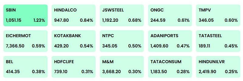 निफ्टी पर SBI, हिंडाल्को, JSW स्टील, आइशर मोटर्स और TMPV प्रमुख बढ़त वाले शेयरों में शामिल रहे. वहीं श्रीराम फाइनेंस, एशियन पेंट्स, इंटरग्लोब एविएशन, अपोलो हॉस्पिटल्स और टेक महिंद्रा दबाव में नजर आए. अगर सेक्टोरल इंडेक्स की बात करें तो सेक्टोरल इंडेक्स में ऑटो, मेटल और PSU बैंकिंग में तेजी देखने को मिली.