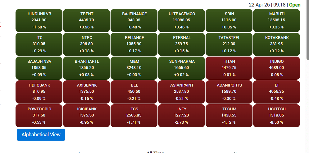 Stock Market Opening Bell : कमजोर ग्लोबल संकेतों के बीच 22 अप्रैल को भारतीय शेयर बाजार की शुरुआत गिरावट के साथ हुई, जहां निफ्टी 24,500 के नीचे फिसल गया. Sensex 463 अंक यानी 0.48 फीसदी गिरकर 78,795 के स्तर पर ट्रेड करता दिखा, जबकि Nifty 116 अंक यानी 0.38 फीसदी की कमजोरी के साथ 24,464 पर रहा. शुरुआती कारोबार में मार्केट ब्रेड्थ पॉजिटिव रही, जहां करीब 1437 शेयरों में तेजी, 883 में गिरावट और 151 शेयरों में कोई बदलाव नहीं हुआ. सेक्टोरल इडेक्स की बात करें तो निफ्टी आईटी में भारी गिरावट देखने को मिली.