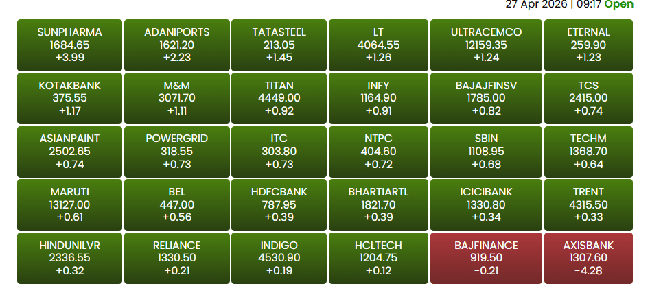 Stock Market Opening Bell : ग्लोबल मार्केट से मिले पॉजिटिव संकेतों के दम पर 27 अप्रैल को भारतीय शेयर बाजार ने मजबूत शुरुआत की. निवेशकों में उम्मीद है कि पश्चिम एशिया में जारी तनाव में कमी आ सकती है, जिससे ग्लोबल मार्केट सेंटीमेंट बेहतर हुआ है. कारोबार के दौरान निफ्टी 50 करीब 0.48 फीसदी यानी 135.35 अंक की बढ़त के साथ 24,021 के स्तर पर ट्रेड करता दिखा. वहीं सेंसेक्स 0.41 फीसदी यानी 415 अंक चढ़कर 77,089.17 पर पहुंच गया. सेक्टोरल इंडेक्स में मेटल, फार्मा और रियल्टी शेयरों में बंपर तेजी देखने को मिली.