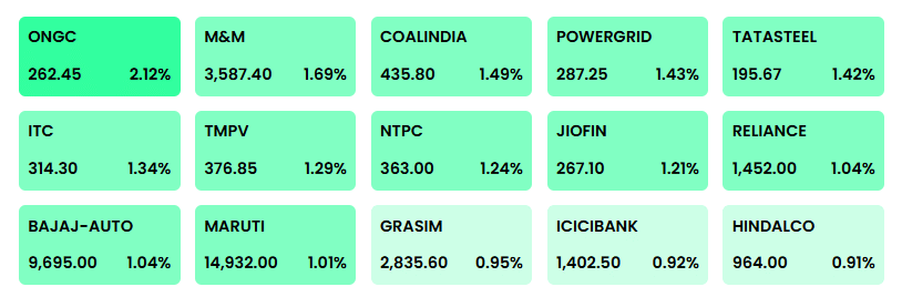 निफ्टी पर पावर ग्रिड कॉरपोरेशन, टाटा स्टील, कोल इंडिया, ओएनजीसी और एनटीपीसी जैसे शेयर बढ़त के साथ कारोबार कर रहे थे. वहीं दूसरी ओर आईटी सेक्टर में बिकवाली का दबाव दिखा, जहां एचसीएल टेक, इंफोसिस, टेक महिंद्रा, विप्रो और टीसीएस प्रमुख गिरावट वाले शेयरों में शामिल रहे.