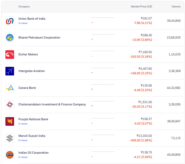 शेयर बाजार में जारी गिरावट का असर कुछ शेयरों पर भी साफ देखने को मिल रहा है. बैंकिंग, ऑटो और तेल-गैस सेक्टर के कई प्रमुख स्टॉक्स लाल निशान में कारोबार कर रहे हैं. यूनियन बैंक, भारत पेट्रोलियम, ईचर मोटर्स और इंटरग्लोब एविएशन जैसे शेयरों में गिरावट दर्ज की गई, जबकि मारुति सुजुकी और इंडियन ऑयल भी दबाव में नजर आए.