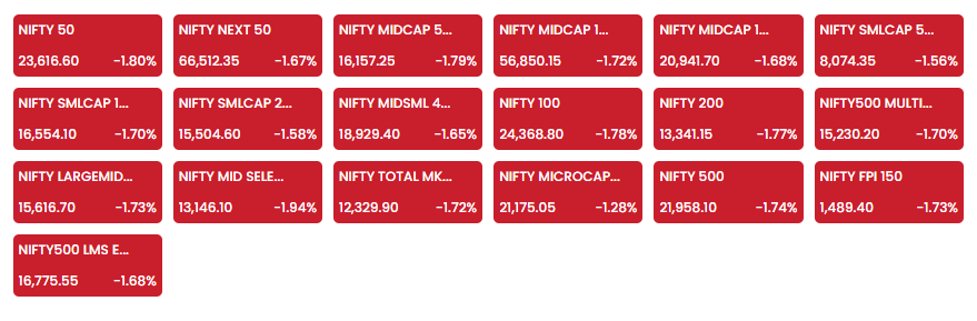 बाजार में आज भारी गिरावट के बाद लगभग सभी प्रमुख इंडेक्स लाल निशान में कारोबार कर रहे हैं. निफ्टी 50 से लेकर मिडकैप, स्मॉलकैप और माइक्रोकैप इंडेक्स तक 1.5% से 2% के बीच की गिरावट दर्ज की गई.