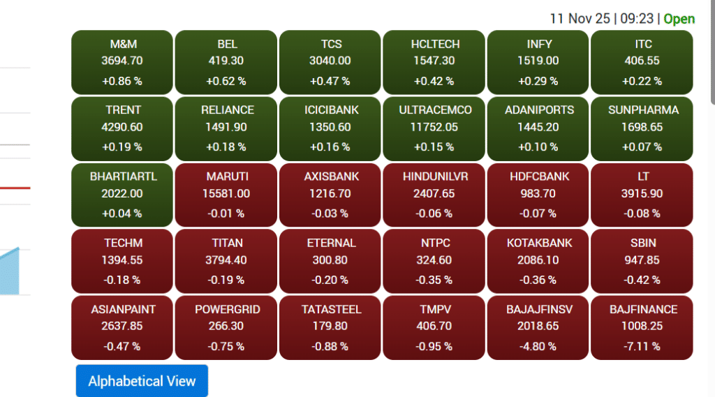 Stock Market Opening Bell: आज,11 नवंबर को बाजार तेजी के साथ खुला. हालांकि कुछ ही मिनटों में बाजार ने चाल बदल दी. शुरुआती कारोबार में सेंसेक्स 116 अंकों की गिरावट के साथ 83,418 के लेवल पर, वहीं निफ्टी 32 अंक गिरकर 25,532 के स्तर पर कारोबार कर रहा था. इस दौरान सेंसेक्स के 30 शेयरों में 13 में तेजी और 17 में गिरावट देखने को मिली. इस दौरान निफ्टी के सेक्टोरल इंडेक्स में आईटी और ऑटो शेयरों में खरीदारी देखने को मिली. वहीं, मेटल और FMCG शेयरों में गिरावट देखने को मिली.
