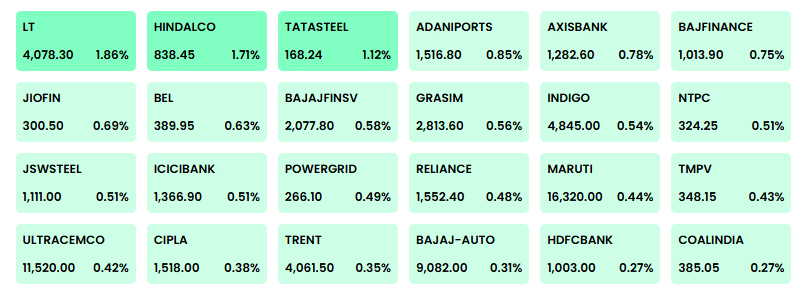 मार्केट ब्रेड्थ मज़बूत रही. 462 शेयर चढ़े, 581 गिरे, जबकि 184 शेयर बिना बदलाव के रहे. निफ्टी के प्रमुख गेनर्स में Hindalco, L&T, Tata Steel, Bajaj Finance और Axis Bank शामिल रहे. दूसरी ओर Max Healthcare, Shriram Finance, Tech Mahindra, SBI Life Insurance और Apollo Hospitals शुरुआती कारोबार में दबाव में रहे.