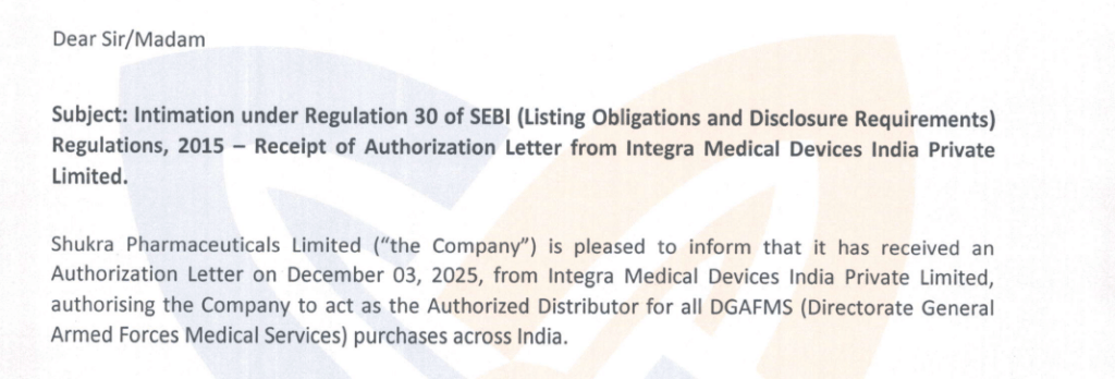 कंपनी ने 3 दिसम्बर 2025 को बताया कि उसे Integra Medical Devices India Pvt Ltd से एक Authorisation Letter प्राप्त हुआ है, जिसके तहत Shukra Pharmaceuticals को पूरे भारत में DGAFMS (Directorate General Armed Forces Medical Services) की सभी खरीद के लिए अधिकृत डिस्ट्रीब्यूटर नियुक्त किया गया है.