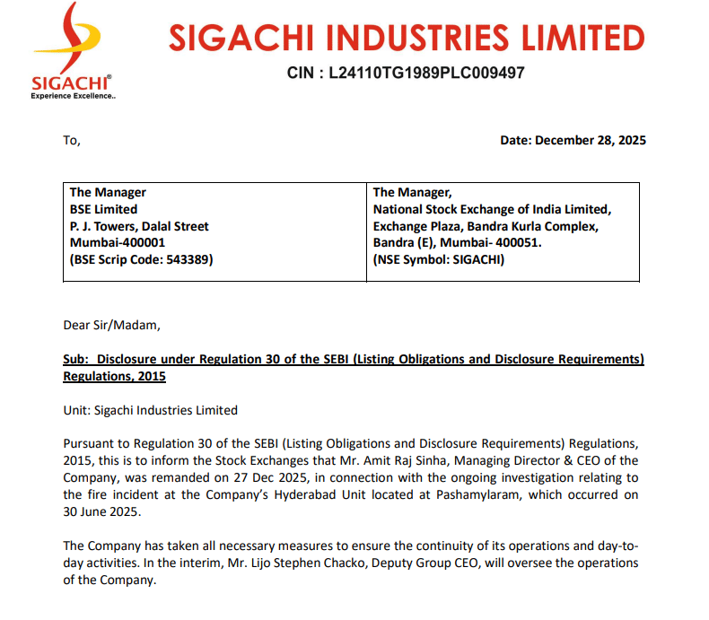 कंपनी की 28 दिसंबर 2025 की रेगुलेटरी फाइलिंग के मुताबिक, मामला 30 जून 2025 को हैदराबाद के पास पाशमायलारम स्थित Sigachi Industries की यूनिट में लगी आग से जुड़ा है. जांच एजेंसियों ने इस केस में आगे की पूछताछ के लिए अमित राज सिन्हा को 27 दिसंबर 2025 को रिमांड पर लिया है.