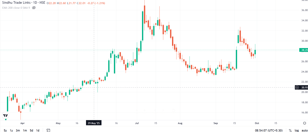 Sindhu Trade Links Share Price: मंगलवार को Sindhu Trade Links Ltd (STTL) के शेयरों में जोरदार तेजी देखी गई. स्टॉक 7.77 फीसदी उछलकर 29.25 रुपये पर पहुंच गया, जबकि पिछला क्लोजिंग प्राइस 27.14 रुपये था. यह शेयर पिछले 52 हफ्तों में 12.90 रुपये के लो से 39.25 रुपये के हाई तक जा चुका है. खास बात यह है कि विदेशी निवेशकों (FIIs) ने इसमें जून 2025 में 3.25 करोड़ से ज्यादा शेयर खरीदे और अब कंपनी में उनकी हिस्सेदारी 2.16 फीसदी तक बढ़ गई है.