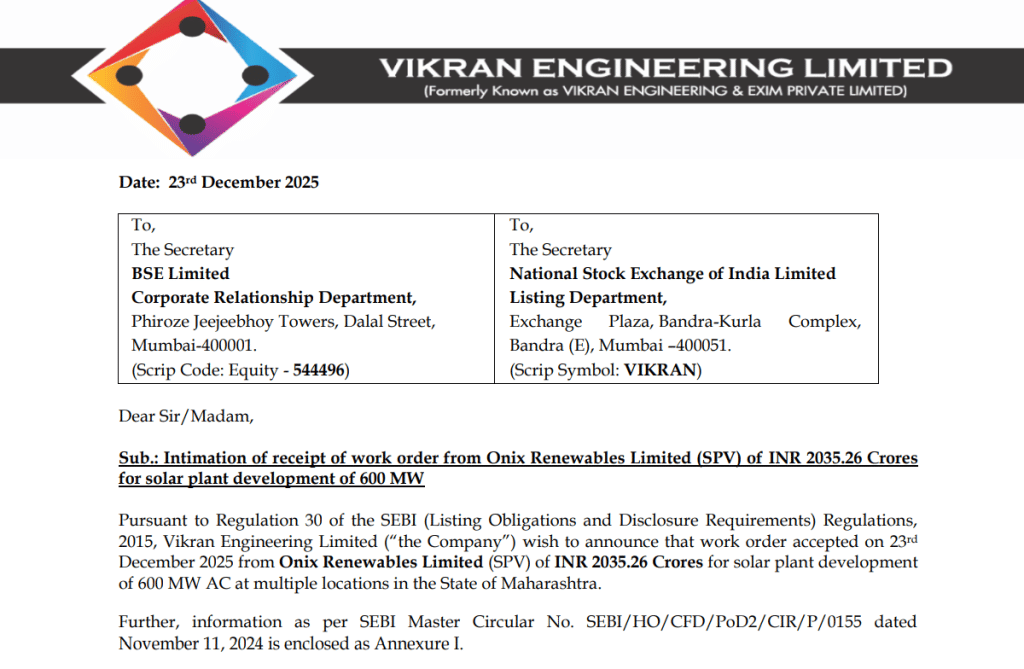 Vikran Engineering Ltd को मिला यह 2,035.26 करोड़ रुपये का EPC ऑर्डर 600 MW AC सोलर प्रोजेक्ट्स के निर्माण से जुड़ा है. यह प्रोजेक्ट टर्नकी EPC आधार पर पूरा किया जाएगा, जिसमेंडिजाइन, इंजीनियरिंग, प्रोक्योरमेंट, सप्लाई, इरेक्शन, टेस्टिंग और कमीशनिंग जैसी सभी सेवाएं शामिल होंगी.