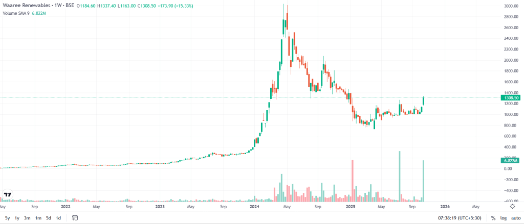- Waaree Renewable का शेयर 16 अक्टूबर को 10.83 प्रतिशत चढ़कर 1308.5 रुपये पर पहुंच गया.