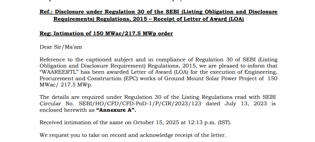 कंपनी को जो Letter of Award (LOA) मिला है, वह एक ग्राउंड माउंट सोलर पावर प्रोजेक्ट के लिए है, जिसकी क्षमता 150 MWac / 217.5 MWp होगी. यह इंजीनियरिंग, प्रोक्योरमेंट और कंस्ट्रक्शन (EPC) कॉन्ट्रैक्ट है, जिसकी वैल्यू लगभग 156.66 करोड़ रुपये है. इस बड़े घरेलू प्रोजेक्ट को Waaree Renewable वित्त वर्ष 2026-27 के दौरान पूरा करेगी.