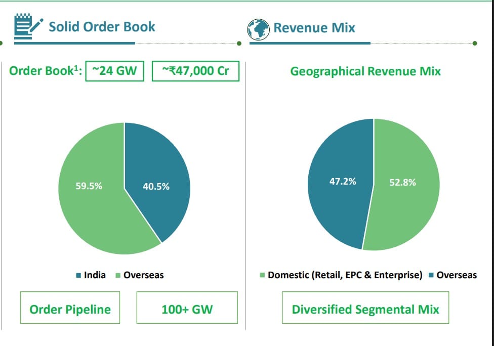 Waaree Energies के लिए अमेरिका एक अहम सोलर बाजार है. कंपनी न सिर्फ अमेरिका को निर्यात करती है बल्कि वहां मैन्युफैक्चरिंग यूनिट भी बना रही है और लगातार निवेश बढ़ा रही है. Waaree Energies की वेबसाइट पर उपलब्ध जानकारी के अनुसार, कंपनी की मौजूदा ऑर्डर बुक लगभग 24 गीगावॉट (GW) की है जिसकी अनुमानित वैल्यू करीब 47,000 करोड़ रुपये है. इसके अलावा 100+ गीगावॉट की मजबूत ऑर्डर पाइपलाइन है. ऑर्डर बुक की बात करें कंपनी को 59.5% ऑर्डर भारत से और 40.5% ऑर्डर ओवरसीज मार्केट से मिले हैं. वहीं, कंपनी को 52.8% रेवेन्यू डोमेस्टिक (रिटेल, EPC और एंटरप्राइज) से जबकि 47.2% ओवरसीज से आता है.