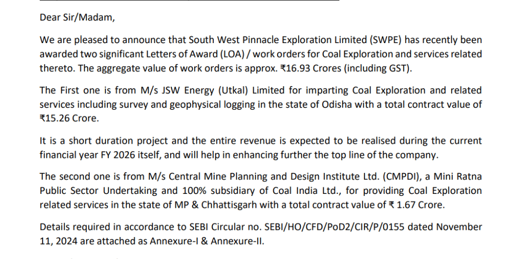 स्टॉक एक्सचेंज को दी गई जानकारी के मुताबिक, SWPE को दो अहम Letter of Award (LOA) और वर्क ऑर्डर मिले हैं जिनकी कुल वैल्यू 16.93 करोड़ रुपये है.
