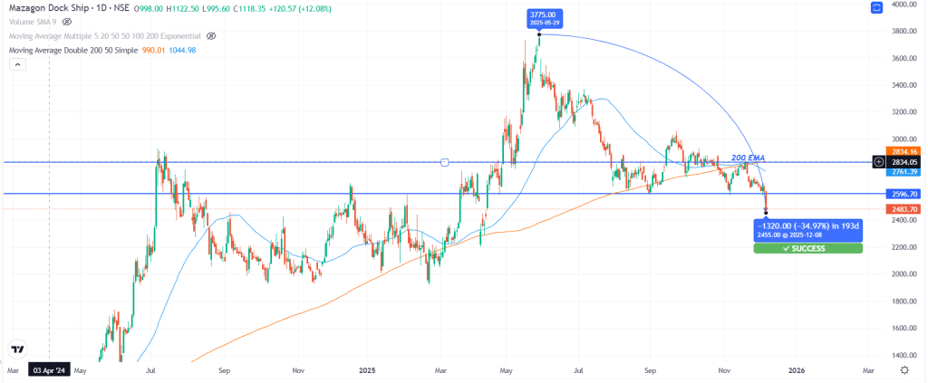 Mazagon Dock डिफेंस रैली का सुपरस्टार रहा है और निवेशकों की नजर में अभी भी लॉन्ग टर्म स्टोरी मजबूत है. लेकिन चार्ट संकेत दे रहे हैं कि स्टॉक में थकान बढ़ रही है. यह स्टॉक भी Descending Triangle पैटर्न से नीचे फिसल चुका है, जो पहले ही बिकवाली का संकेत देता है. इसके साथ ही स्टॉक ने 50EMA और 200EMA से कई बार रिजेक्शन झेली है, यानी हर रैली पर बेचाव बढ रहा है. जब कोई स्टॉक लगातार मूविंग एवरेज पार करने में असफल रहे, तो यह साफ संकेत है कि शॉर्ट टर्म ट्रेंड कमजोर हो चुका है. ऐसे में शॉर्ट से मीडियम टर्म निवेशकों के लिए यह Breakdown काफी अहम है.