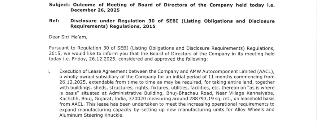 ऑपरेशनल बदलावों के तहत Steel Strips Wheels ने अपनी सब्सिडियरी AACL के साथ लीज एग्रीमेंट किया है. यह समझौता कंपनी की विस्तार योजना और लागत व संचालन को बेहतर बनाने की रणनीति का हिस्सा माना जा रहा है.