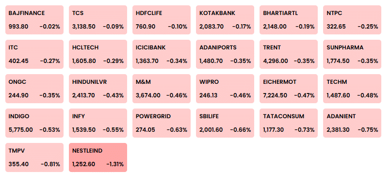 Stock Market Opening Bell: पॉजिटिव ग्लोबल संकेतों के बीच 25 नवंबर को भारतीय बाजार हाईर ओपन हुआ. हालाकि शुरुआती मजबूती टिक न सकी और सेंसेक्स 98 अंक नीचे फिसलकर 84,802 पर आ गया, जबकि निफ्टी 25 अंक गिरकर 25,933 पर ट्रेड कर रहा था. मार्केट ब्रेड्थ मिक्स रहा. 1076 शेयर बढे, 1020 शेयर गिरे, और 186 शेयर बिना बदलाव के रहे. निफ्टी में Max Healthcare, Dr Reddys Labs, Asian Paints, Titan Company और SBI प्रमुख गेनर रहे. वहीं SBI Life Insurance, Reliance Industries, ICICI Bank, Tech Mahindra और Trent दबाव में रहे. सेक्टोरल इंडेक्स में मेटल शेयरों में तेजी देखने को मिली.