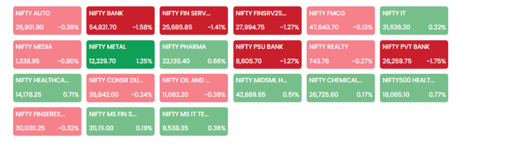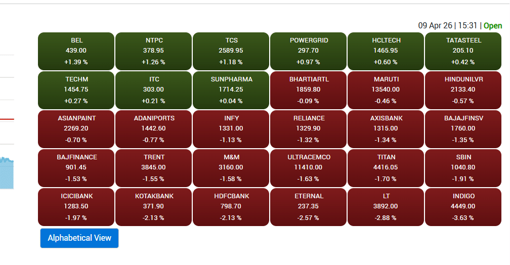 निफ्टी में L&T, इंटरग्लोब एविएशन, HDFC बैंक, श्रीराम फाइनेंस और Jio फाइनेंशियल सबसे कमजोर रहे, जबकि Dr. Reddy’s लैब्स, हिंदाल्को, बजाज ऑटो, भारत इलेक्ट्रॉनिक्स और ONGC सबसे ज्यादा बढ़त देने वाले शेयर रहे. मिडकैप और स्मॉलकैप आज फ्लैट बंद हुए.