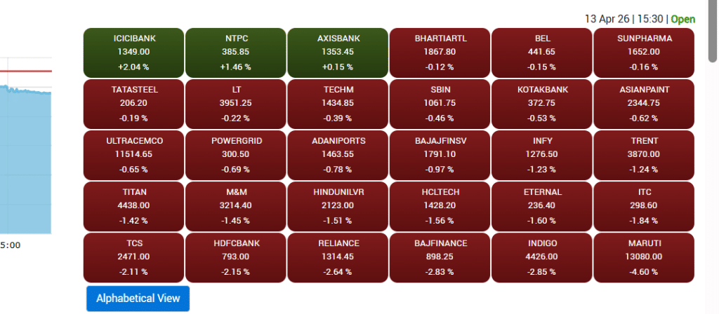 भारतीय शेयर बाजार 13 अप्रैल को कमजोरी के साथ बंद हुआ. शुरुआती कारोबार में सेंसेक्स 1700 अंक तक गिर गया था. हालांकि, बाद में बाजार में शानदार रिकवरी देखने को मिली. दिन के अंत में सेंसेक्स 702.68 अंक या 0.91 फीसदी की गिरावट के साथ 76,847.57 पर बंद हुआ. वहीं निफ्टी 207.95 अंक या 0.86 फीसदी टूटकर 23,842.65 पर क्लोज हुआ. मार्केट ब्रेड्थ की बात करें तो कुल 1716 शेयरों में बढ़त, जबकि 2453 शेयरों में गिरावट दर्ज की गई. 188 शेयर बिना बदलाव के बंद हुए.
