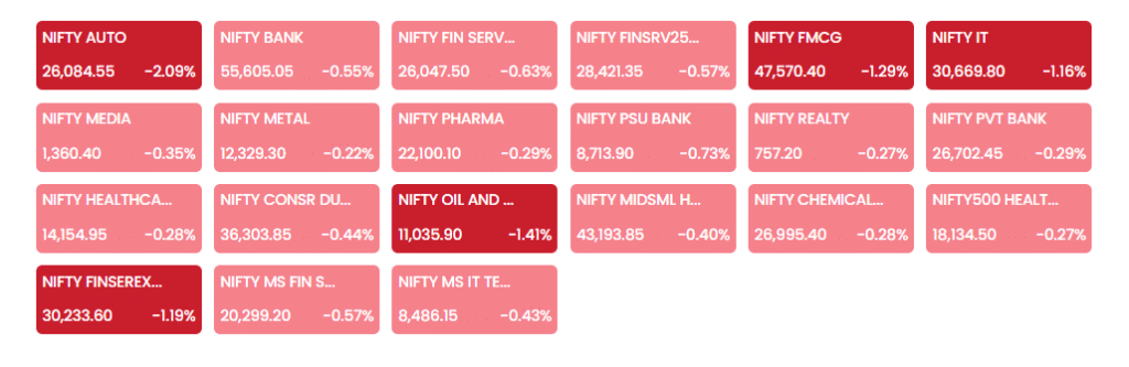 सेक्टोरल इंडेक्स की बात करें तो पावर, डिफेंस और टेलीकॉम को छोड़कर लगभग सभी सेक्टर लाल निशान में बंद हुए. FMCG, ऑटो, IT, एनर्जी और ऑयल एंड गैस सेक्टर में करीब 1 फीसदी की गिरावट देखने को मिली.